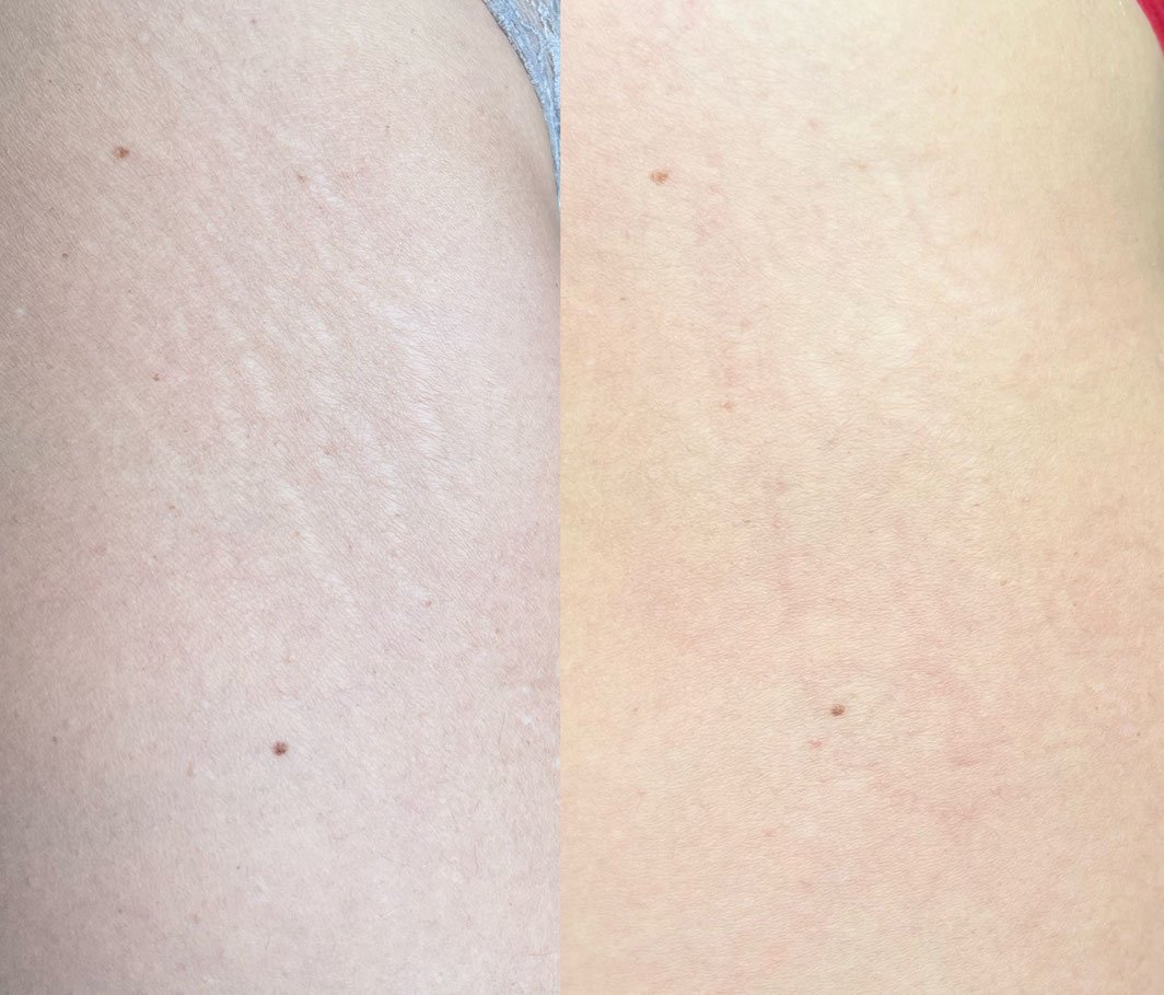 • Esthétique : il réduit visiblement le contraste de couleur entre la peau et les marques (vergetures et cicatrices), offrant un aspect plus homogène et estompé.